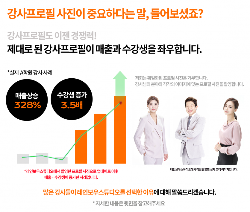 강사프로필 사진이 중요하다 작성자 스튜디오관리자 댓글 0건 조회 724회 작성일 24-05-31 18:27 제대로 된 강사 프로필이 매출과 수강생을 좌우합니다 이전글 <레인보우스튜디오 가족사진> 다음글 [무료 가족사진 이벤트] 에 속지마세요! SNS 가짜 이벤트에 현명한 대처! 목록
